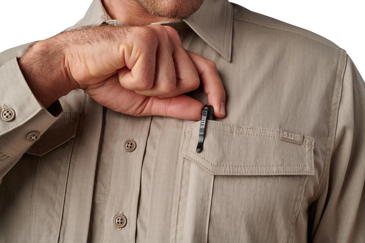 The 5.11 Tactical Men’s ABR Pro Long Sleeve Shirt 72543 features heavyweight performance in a lightweight and durable Flexlite mechanical stretch fabric. The ABR Pro has a large Ready Pocket at each chest, patch pockets (with pen guides) and pen pockets on the left sleeve. A Teflon finish helps keep stains and soil from sticking to the shirt. Full button front placket, adjustable cuffs and roll-up sleeve keepers. Always Be Ready for whatever mission you face in the ABR Pro Shirt.