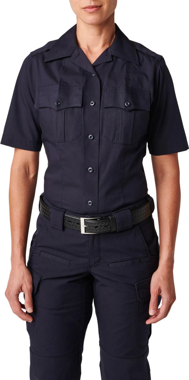 The 5.11 Tactical Women’s NYPD Stryke RipStop Short Sleeve Uniform Shirt 61335 meets the NYPD Spec for uniform shirts and is made with 5.11’s Patented Flex-Tac mechanical stretch ripstop fabric for performance, durability and easy movement. Sewn-in military creases, epaulettes and scalloped chest pockets with pen guides. Button-front closure with an NYPD Approved label sewn into the front placket. Poly/cotton Flex-Tac Ripstop is finished with Teflon for stain and soil-resistance.