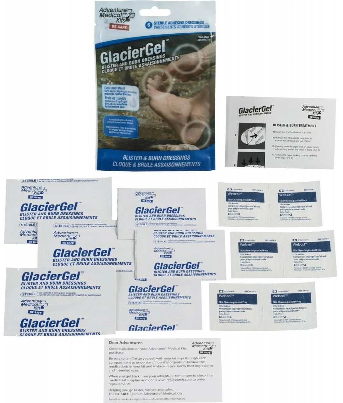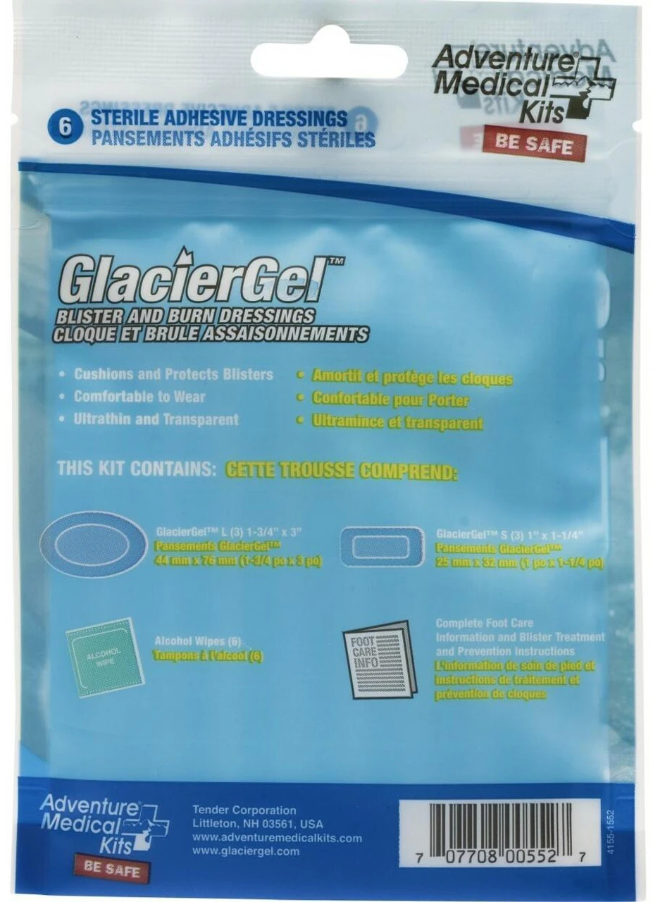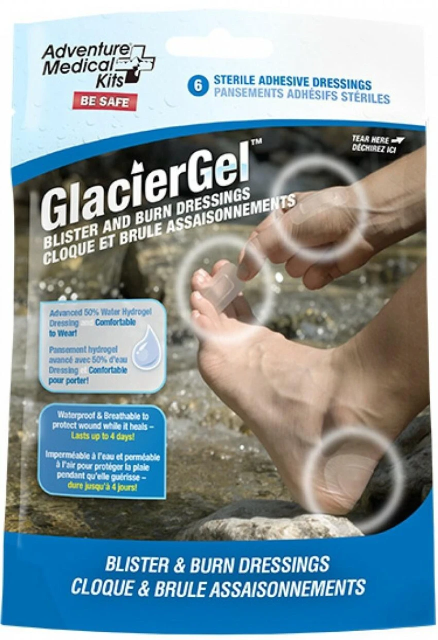 These Adventure Medical Kits GlacierGel Blister and Burn Dressings are easy to apply and stay in place for multiple days. The waterproof, breathable adhesive gels are highly cushioning, cooling and absorbent which provides instant and complete pain relief for blisters and burns.