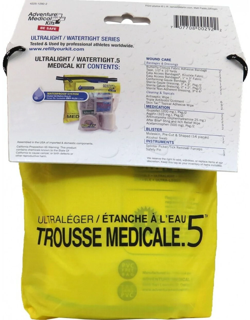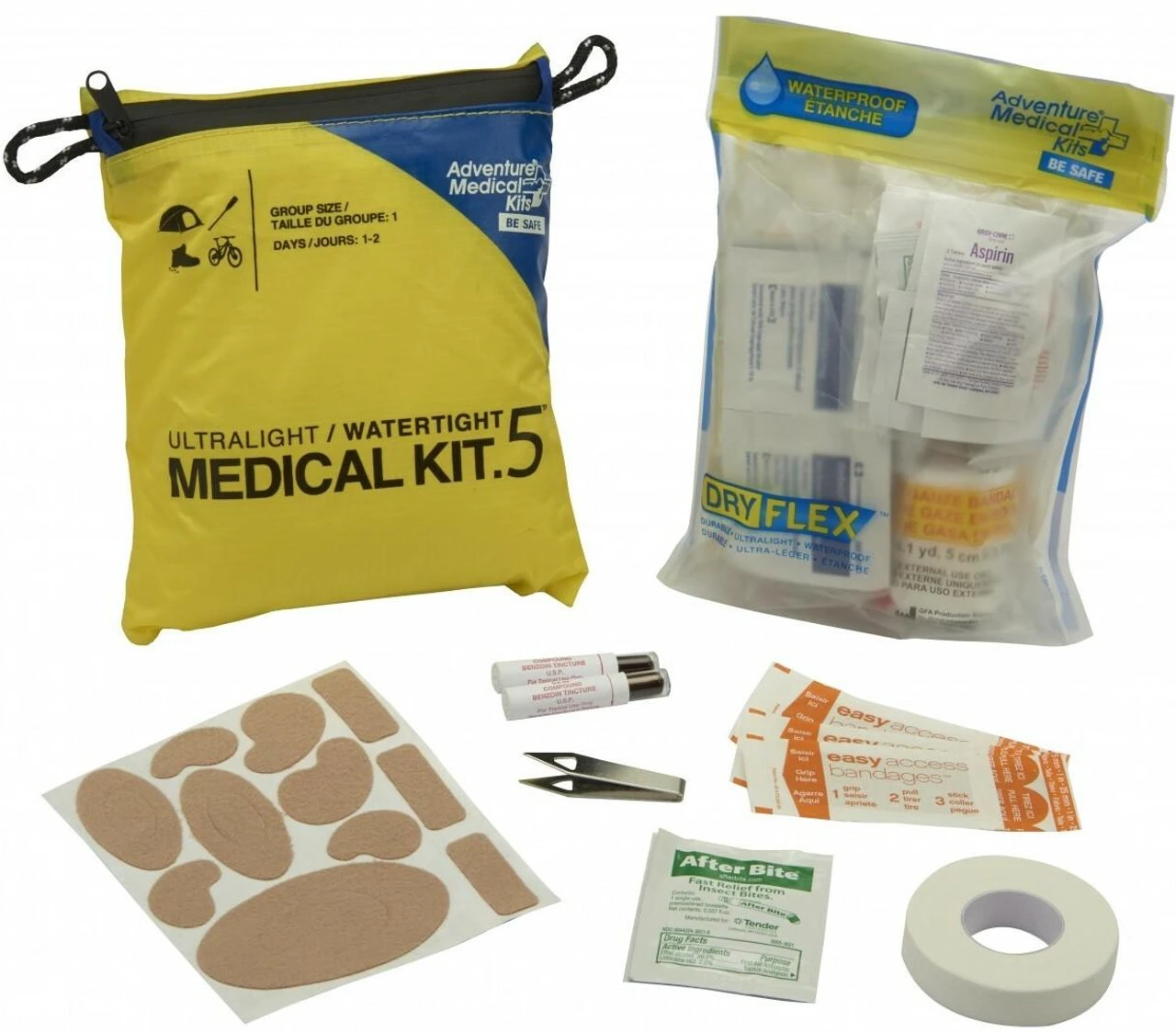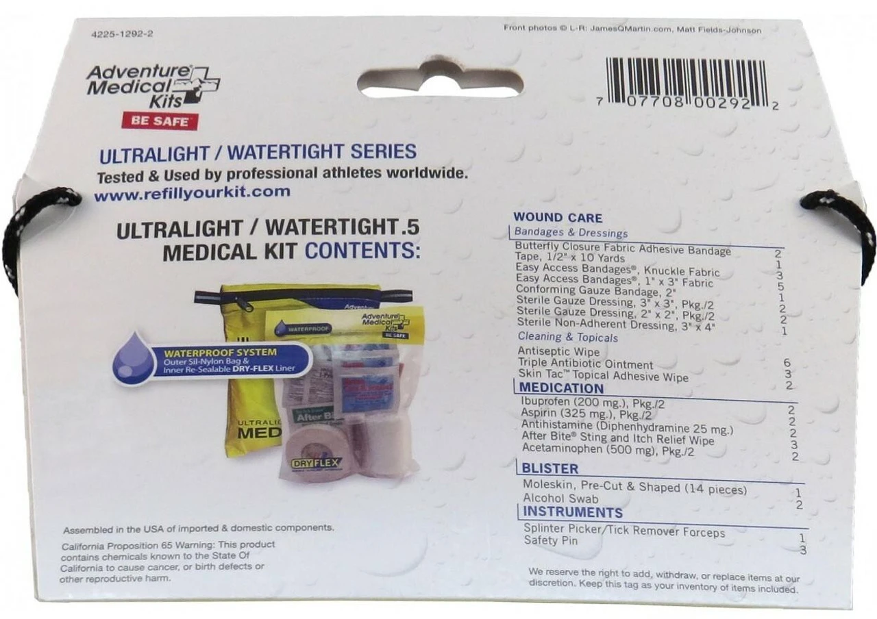 The Adventure Medical Kits Ultralight / Watertight Series .5 features DryFlex bags for the ultimate in ultralight, waterproof storage. For the multi-sport athlete that refuses to be let down or weighed down by his or her gear. The Ultralight / Watertight .5 is perfect for one-to-two-day solo trips when you need an ultralight kit with enough supplies to treat common injuries. Packaged in a rugged, yet lightweight silnylon bag with a DryFlex waterproof liner, the UL / WT .5 will stay dry whatever the elements. The silnylon bag has enough room to add other first aid and survival items and provides rugged protection for the DryFlex liner. Ideal for hiking, kayaking, backpacking, mountain biking and climbing.