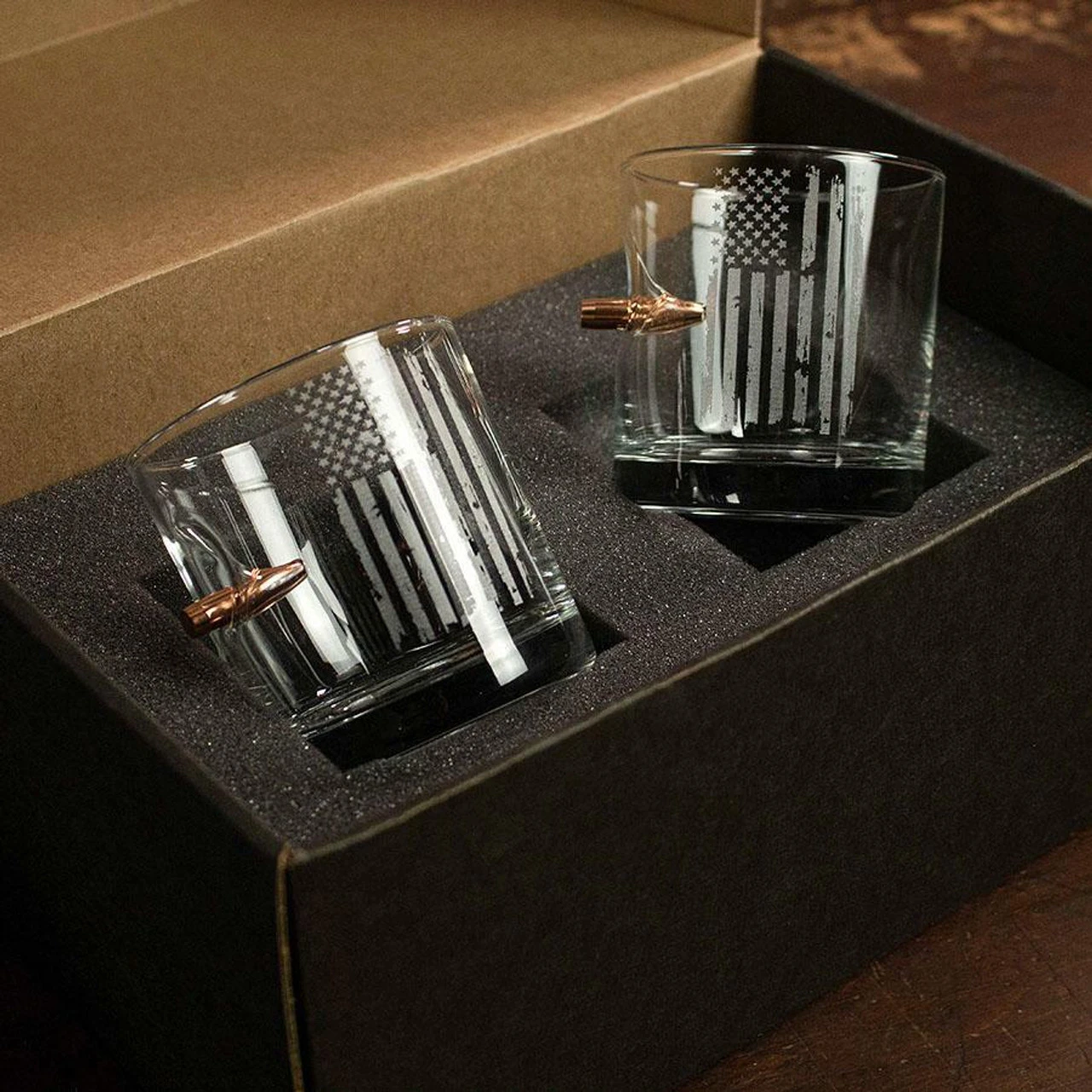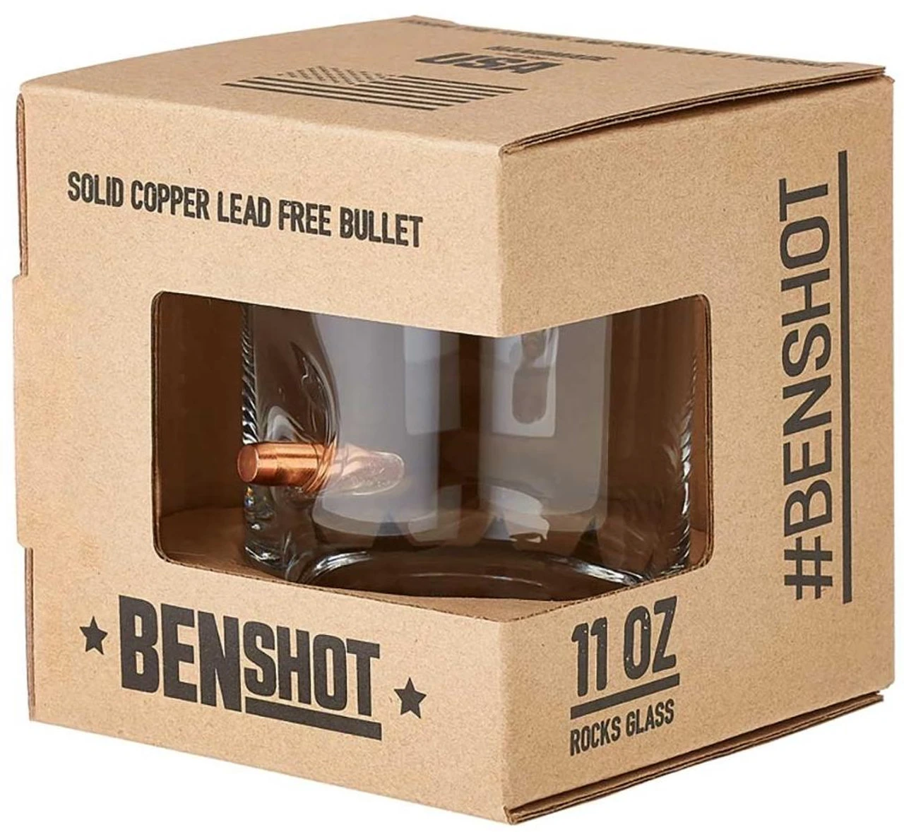 The BenShot Patriotic Rocks 11 oz. Glass features a hand-embedded lead-free real .308 bullet with a custom laser etched with a distressed American Flag design. The glasses come individually packaged in a custom display making it easy and ready to gift.