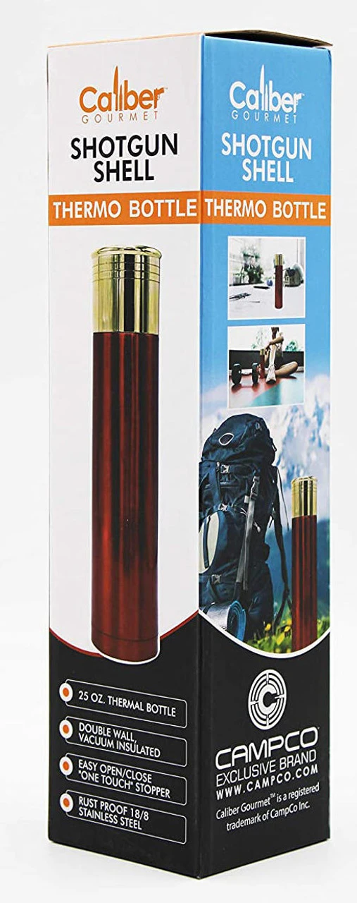 The Caliber Gourmet Shotgun Shell Thermo Bottle is designed to look like a Shell. It keeps favorite drink of choice, hot or cold for up to 9-12 hours. You’ll keep your coffee warm throughout the workday, or your iced coffee fresh for those hot summer days. Unique design of draft Shell shape, cool appearance, excellent stainless steel tank, food grade silicone, super insulation, for temperature extension. Drive up to 100 Celsius or 212 Fahrenheit.