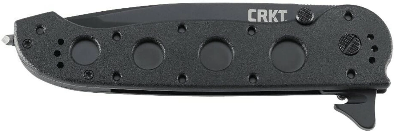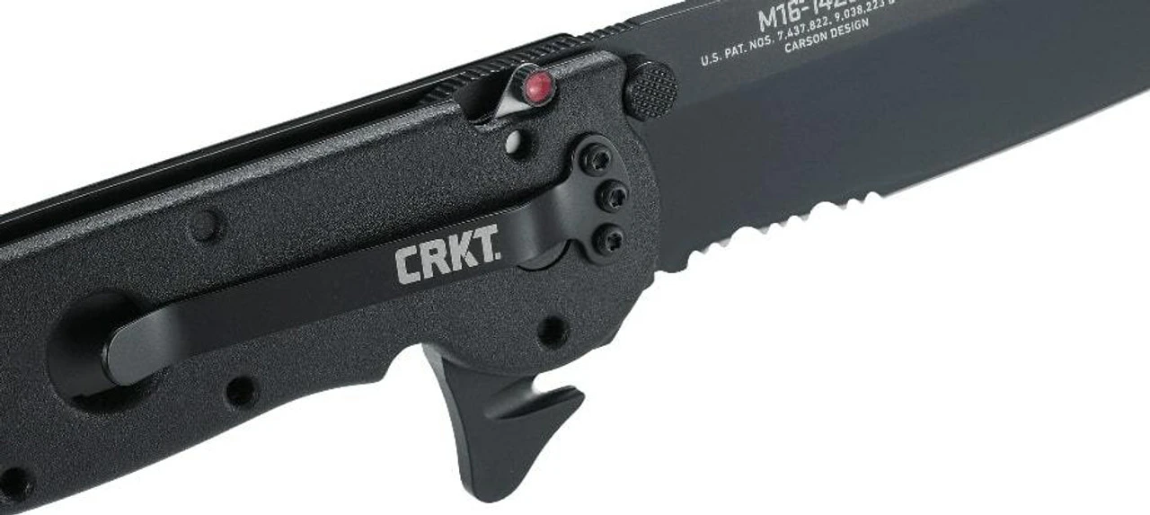 The CRKT M16 Tanto Blade Knife features an InterFrame construction, with tough, textured glass filled nylon scales over a 420J2 stainless steel liner InterFrame and solid glass filled nylon back spacers. The Flipper can be pressed for fast one-hand opening and creates a blade guard when open. At the butt of the knife is a seat belt cutter to the Carson Flipper, and a tungsten carbide window breaker that shatters automobile side windows with one quick whack from the butt of the knife. The premium AUS 8 high-carbon stainless steel for the blades, which have Combined Razor-Sharp and Triple-Point Serrated edges to easily cut rope, cord, canvas, and vegetation. The automated liner safety sets a pin between the locking liner and the frame for an additional layer of safety, so the locking liner is less likely to disengage during use. To close the knife, pull the red buttoned safety lever back, slide the locking liner over, and fold the blade into the closed position.