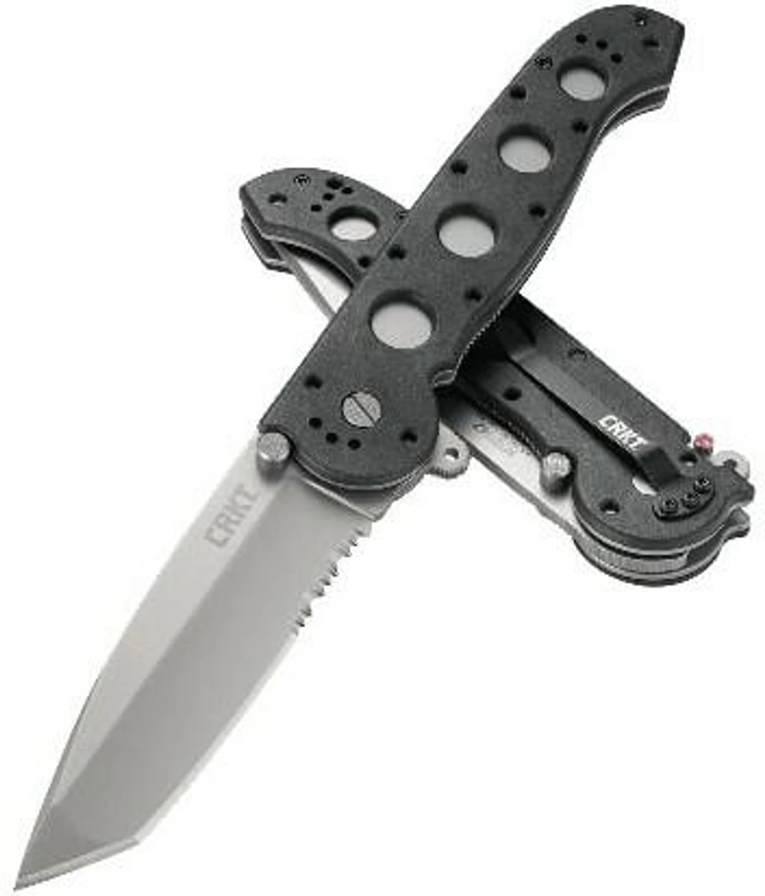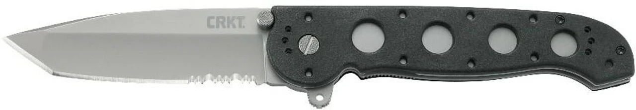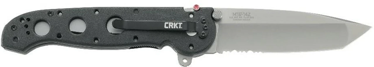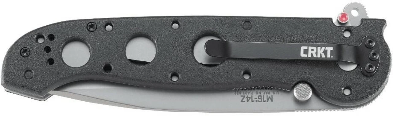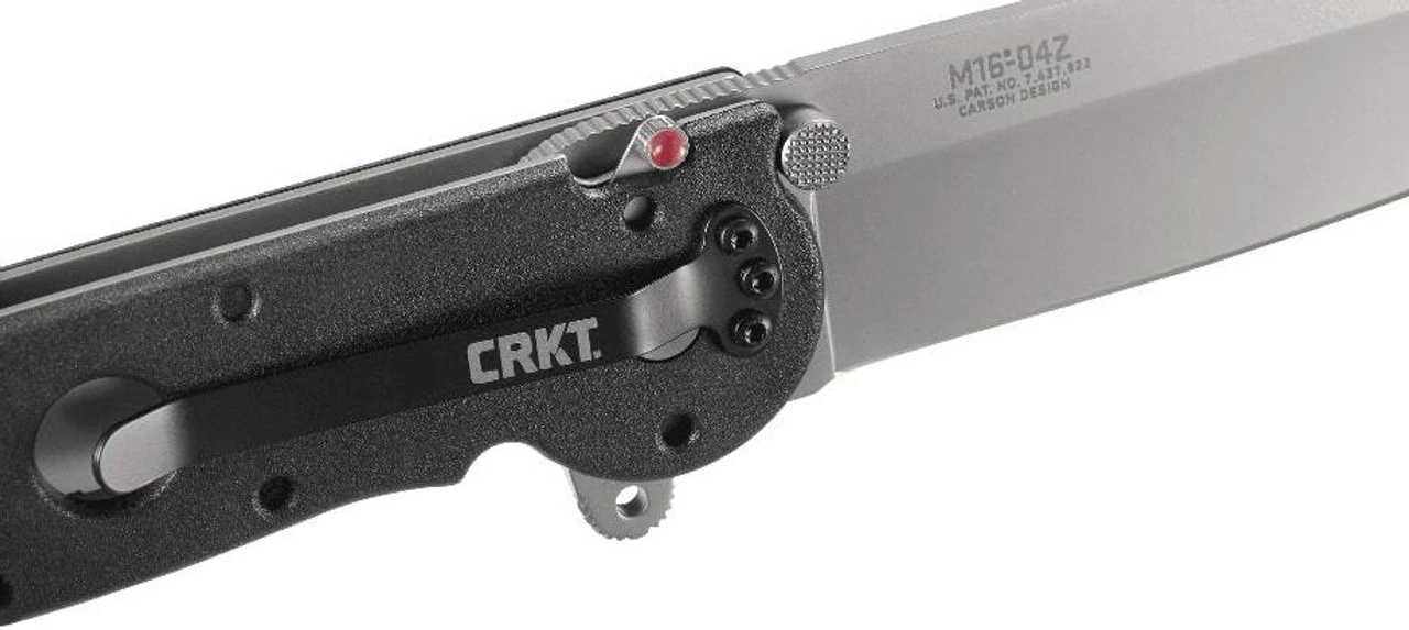 The CRKT M16 Big Dogs Knife features large dual grind tanto-style blades and an InterFrame construction, tough, textured glass filled nylon scales over a 420J2 stainless steel liner InterFrame. The handle is made with superior offset Torx fasteners for a rigid and perfect fit in the hand. The AUS 8 high-carbon stainless steel blades give greater everyday utility and offer both Razor-Sharp and Combined Razor-Sharp and Triple-Point Serrated edges. The Carson Flipper is an aid to opening the blade, especially when wearing gloves, and acts as a blade guard when the blade is open. The automated liner safety sets a pin between the locking liner and the frame for an additional layer of safety, so the locking liner is less likely to disengage during use. To close the knife, pull the red buttoned safety lever back, slide the locking liner over, and fold the blade into the closed position. All styles have lubrous washers and a removable stainless steel clothing/gear clip.