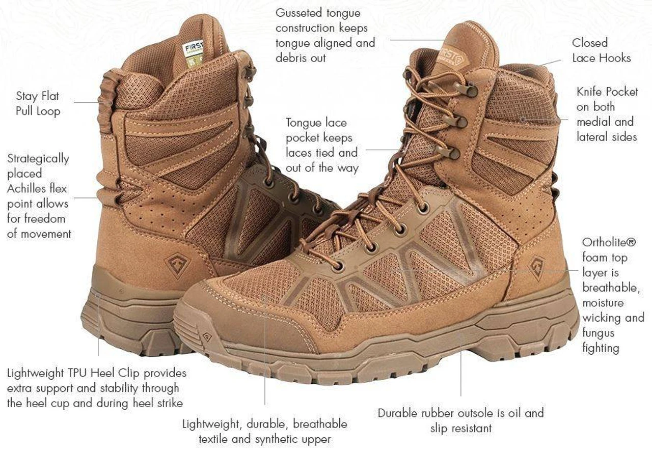 The First Tactical Men’s 7″ Operator Boot are perfect for the mission at hand: lightweight and breathable while maintaining an unmatched level of durability needed for special operations. Boasting a Torsion Flex fiberglass reinforced composite shank that is 75% lighter than steel, the Operator takes inspiration from athletic shoes, providing the flexibility and comfort you expect from a running shoe but with the durability of your favorite tactical boot.