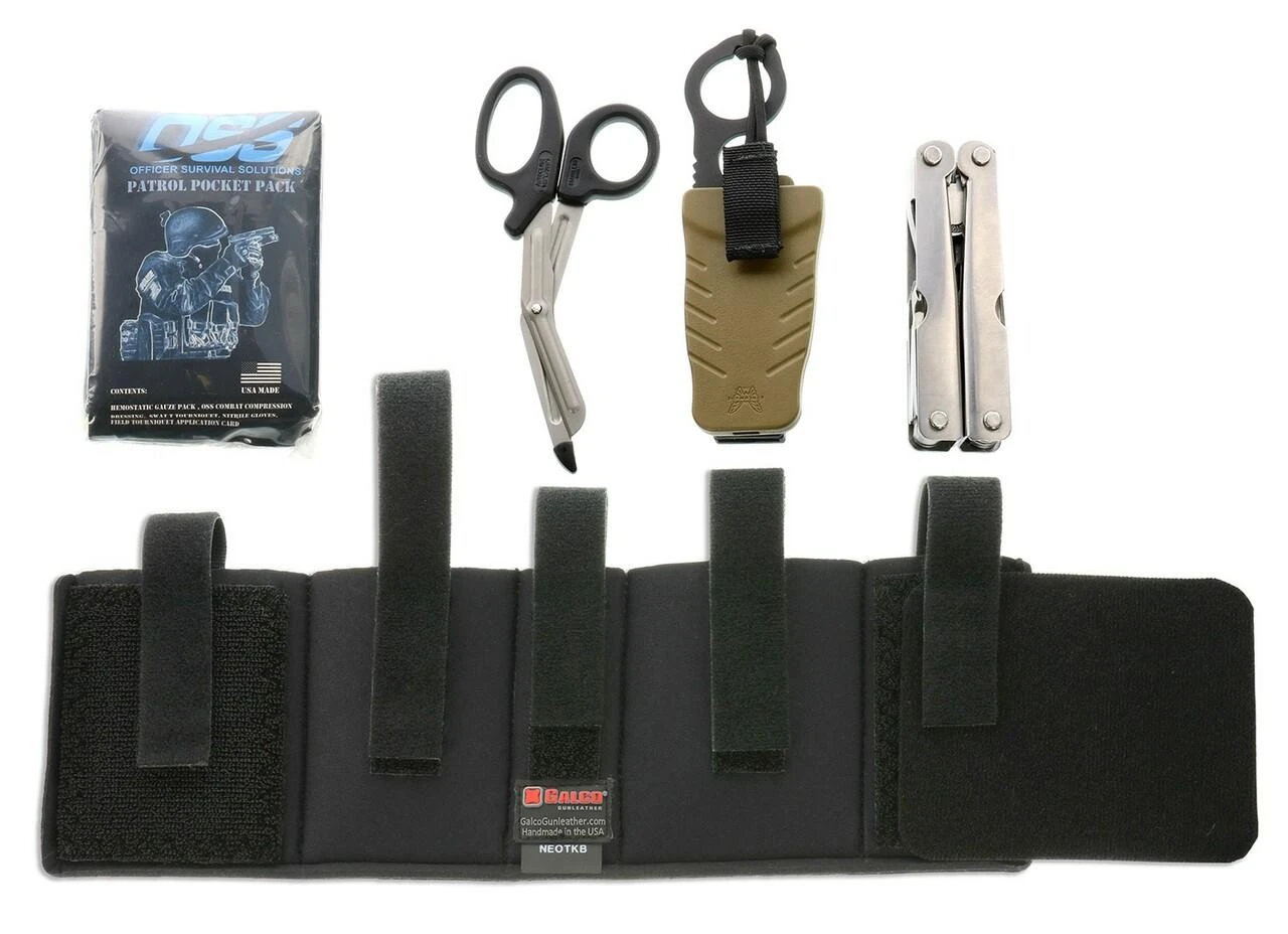 The Galco ATM-KIT (Ankle Trauma Medical Kit) equipment carrier is designed for convenient everyday carry of user-supplied medical tools and equipment for first responders, gun carriers, or anyone who wishes to be prepared in an increasingly dangerous world. The high-grade neoprene band offers secure hook-and-loop closure and five neoprene pockets of various widths, each with a retention strap for security. It accommodates tools and equipment like tourniquets, strap cutters, knives, multitools, bandages, clotting agents or other emergency rescue and first-aid gear.