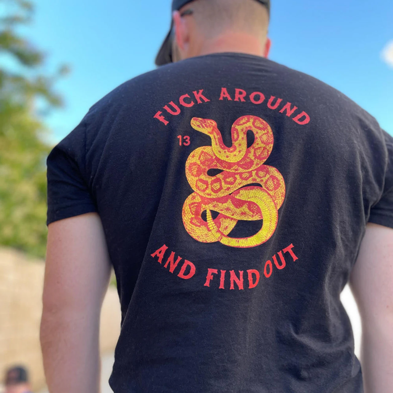 The LAPG Fuck Around & Find Out T-Shirt is perfect for the range, gym, running/hiking trail, or just wearing around the house.
