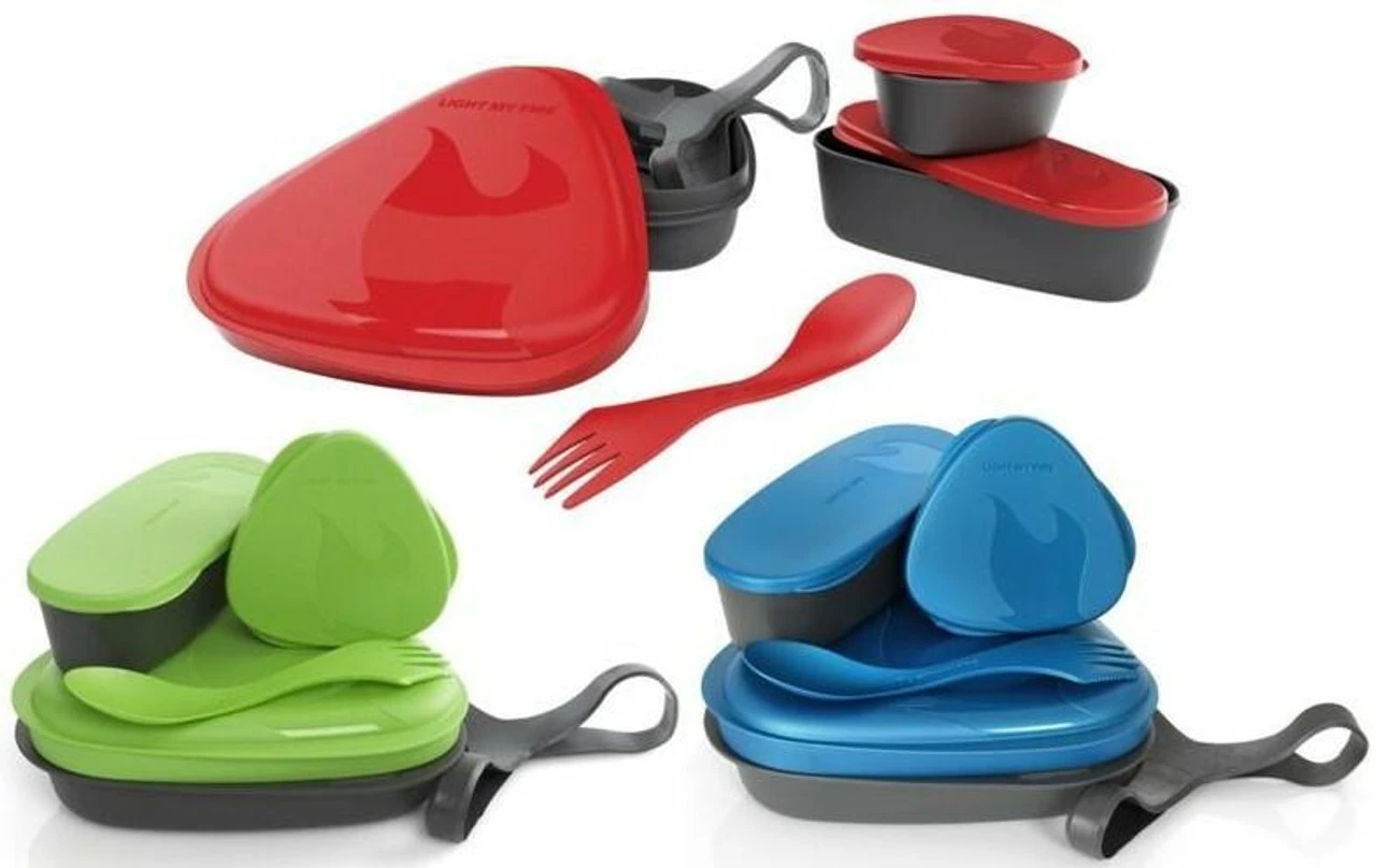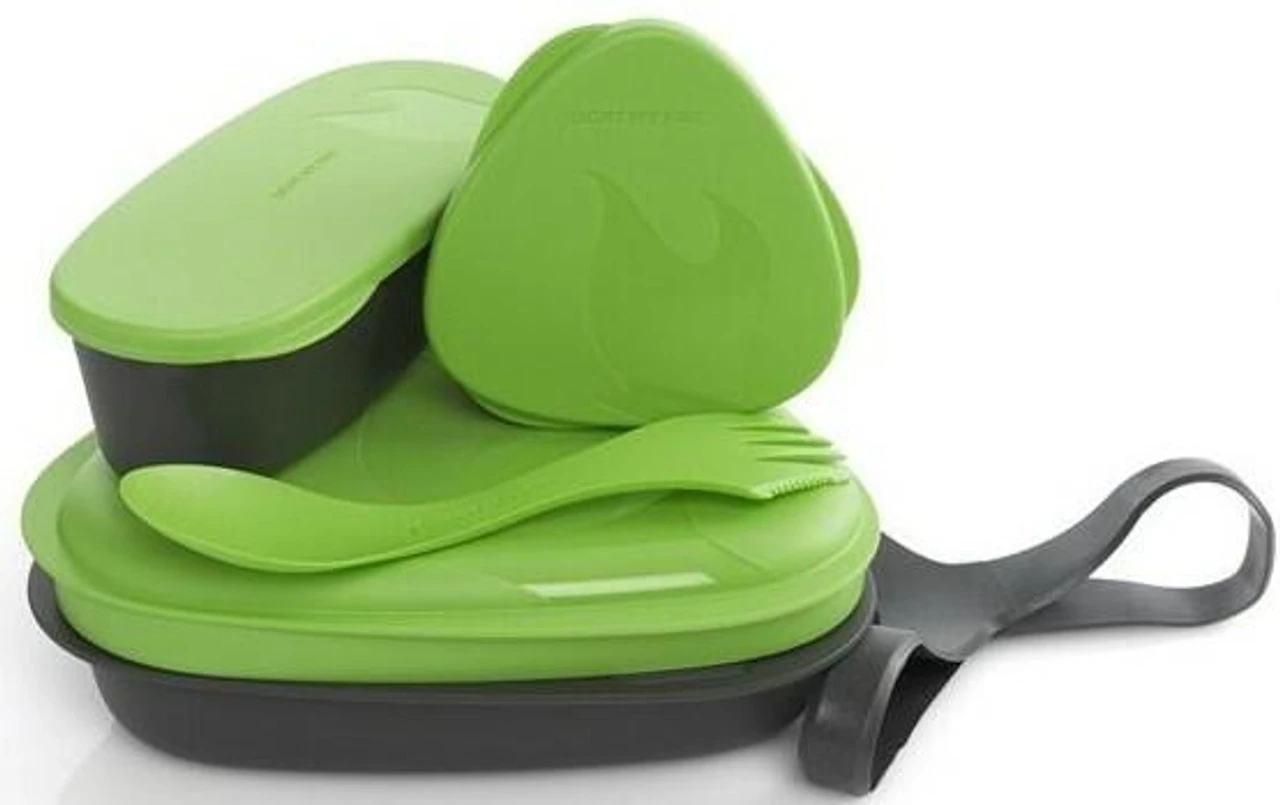 The Lunch Kit comes with two high-edged plates, a Spork (spoon-fork-knife combo) and two waterproof SnapBoxes in different shapes and sizes. Now you can easily organize and store your food with the tight and neat harness that safely keeps your contents stored.