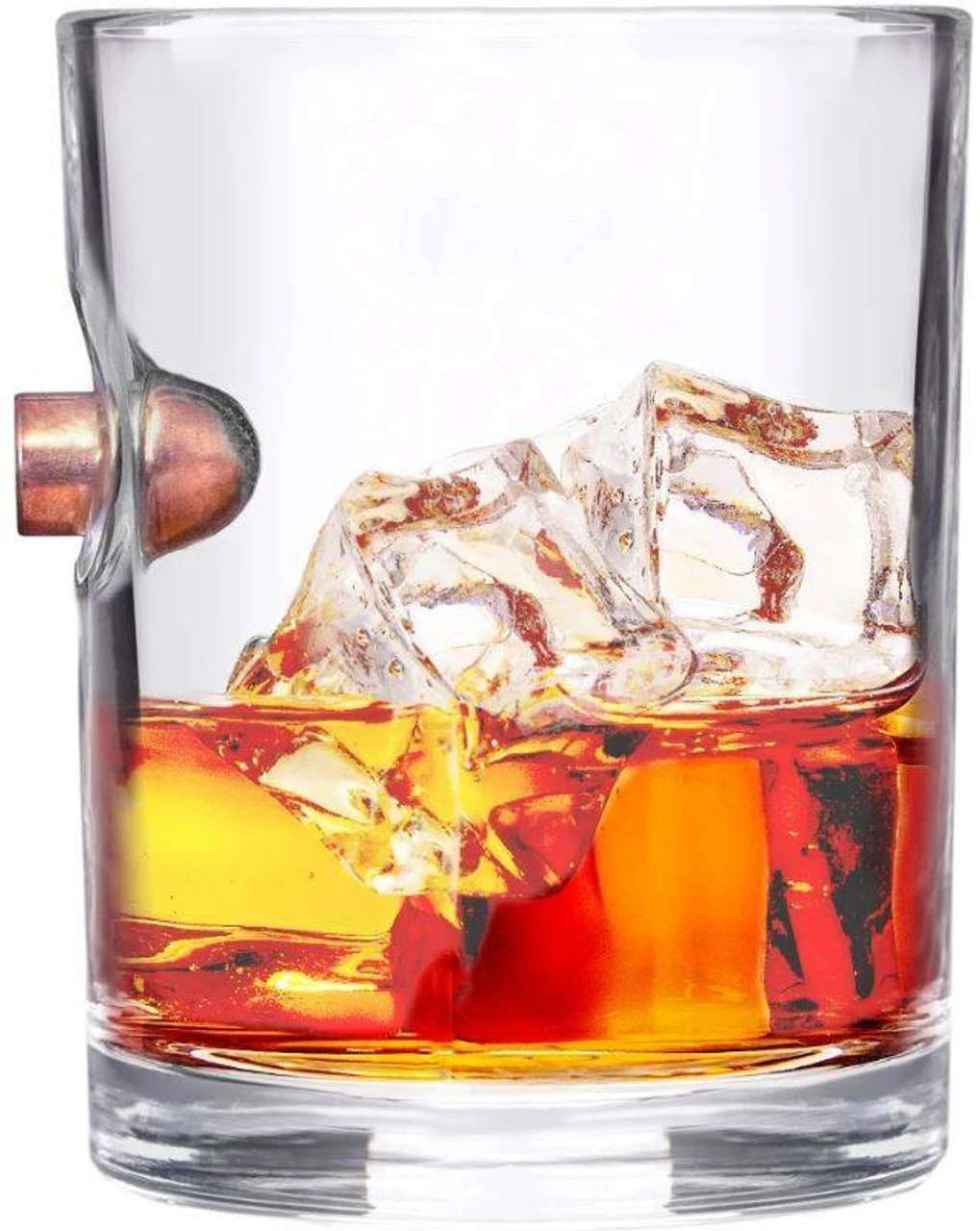 The Lucky Shot .45 Cal Projectile Bullet Whiskey Glass is a 10oz molded whisky glass embedded with a real .45 bullet in the side of the glass. The bullets do not contain any lead or powder residue so they are perfectly safe to drink from.