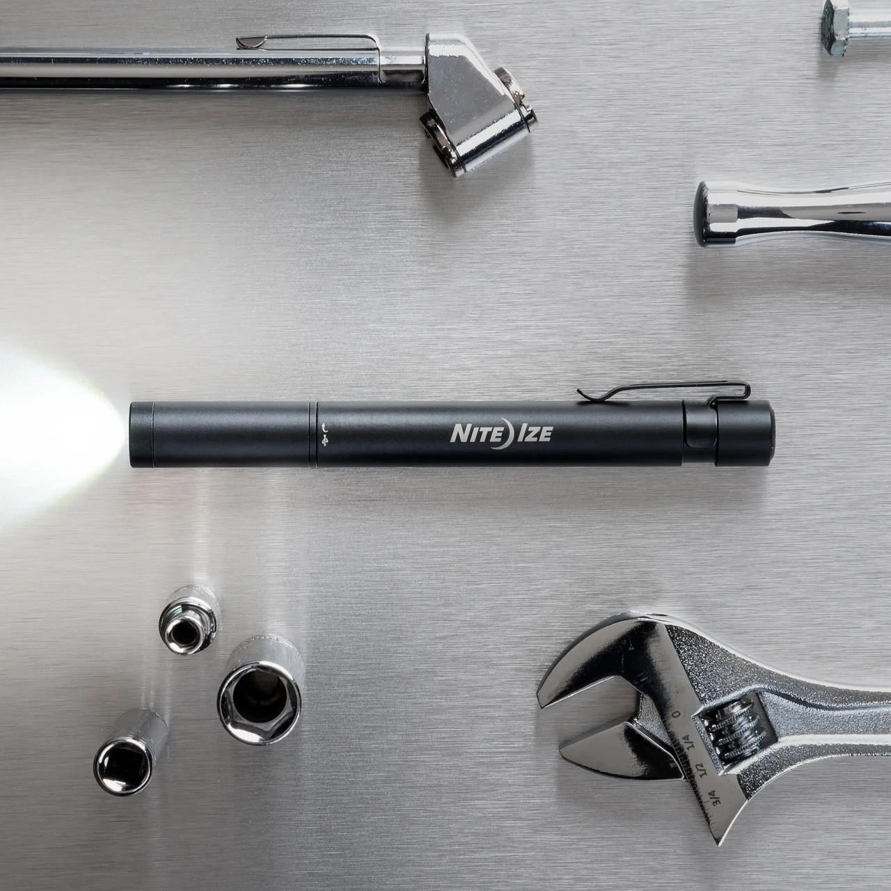 The Nite Ize Radiant Rechargeable Pen Light This USB-rechargeable LED pen light that provides the visibility you need when on-the-job or on-the-go, featuring a slimline design that easily slides into pockets, packs, and more. Complete with a sturdy aluminum body with a smooth black matte finish, this pen-sized design integrates a stainless steel pocket clip for easy carrying and an endcap switch for one-handed operation. It features three modes: high with a maximum 235 lumens, low with a maximum 11 lumens, and power-saving lockout mode. Waterproof-submersible and drop-tested to 1 meter, this rechargeable pen light provides the rugged strength you need on the job or in the backcountry. When it’s time to recharge, simply unscrew the head to reveal the USB-C port and insert the included cable, charging back up in just an hour and a half.