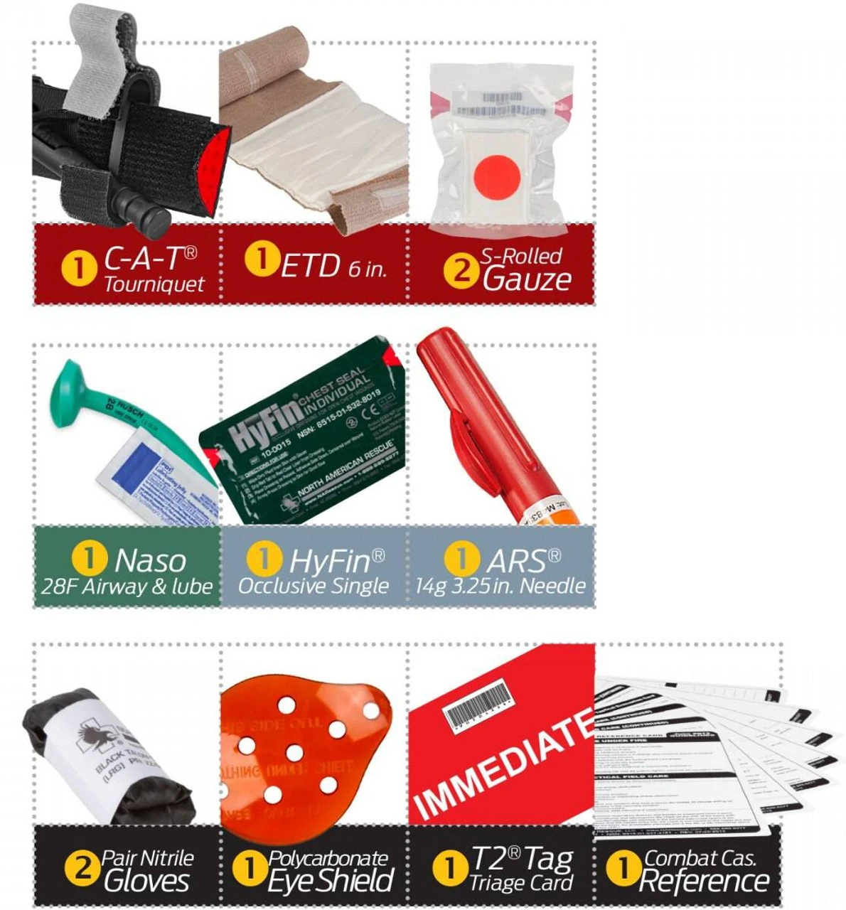 The North American Rescue Individual Kit has been designed and packed to provide all of the tools to prevent the three leading causes of preventable combat death (60% extremity bleeding, 33% tension pneumothorax, 6% airway obstruction). The Modular system can be attached to the operator using the split-tale connector, PALS, Molle style webbing or by fastening to the web, gun belt using the quick weave method. Belt and leg attachment straps can be removed and reattached as needed to allow maximum flexibility during load carriage configuration.