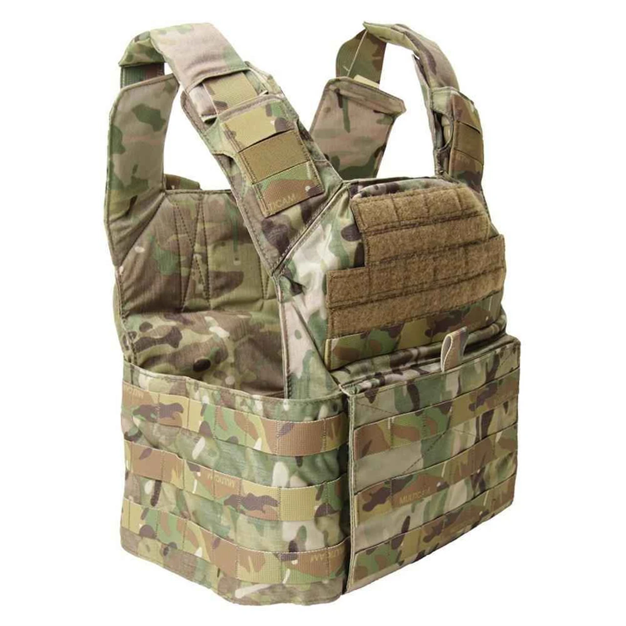 Featuring fully adjustable and padded shoulders, which once adjusted, slides into itself and locks in securely with a hidden quick release buckle. The shoulders have 2 rows of PALS webbing with elastic nylon sewn in between the PALS webbing allowing for comms or hydration tubing. The front and back feature 5 rows of PALS webbing and two 2 inch rows of Loop sewn on for identifiers such as flags and patches. The front and back of the panels of the carrier on the body side are also padded. Rifle plates are loaded from the bottom front/back and secured with a hook/loop closure.