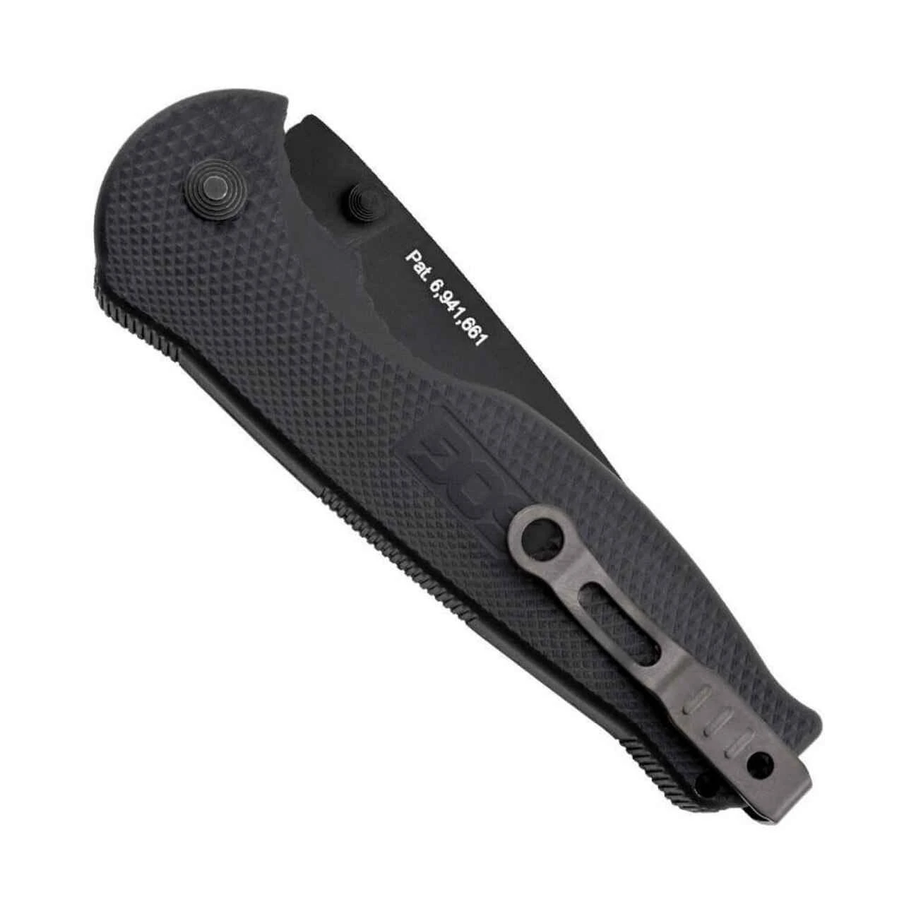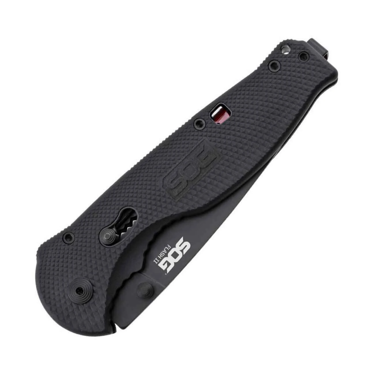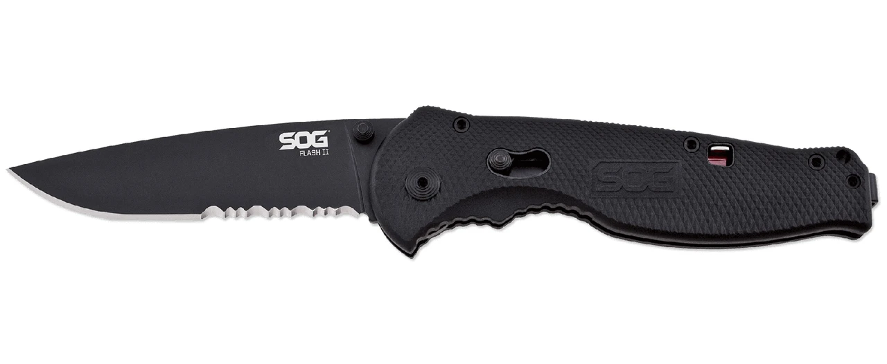 The SOG Flash II Tanto has quick blade access with SOG Assisted Technology (S.A.T.), which employs a powerful piston lock that is easily released with a sliding button. The Flash II Tanto (Straight edge Black TiNi) comes standard with glass-reinforced nylon (GRN) handle and straight edge. All Flash knives come standard with SOG’s patent pending, reversible bayonet mounted clip that ensures the lowest, most discreet carry possible. An additional safety lock was incorporated that gives added security when the blade is closed.