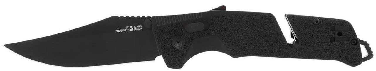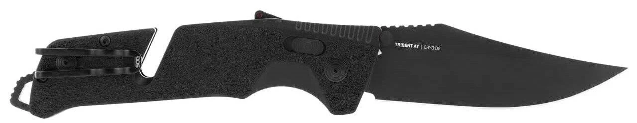 The SOG Trident AT Blackout Folding Knife features rapid assisted opening with SOG’s innovative ambidextrous AT-XR Lock, as well as integrated line cutter and glass breaker. Trident AT is easy to carry, with a highly functional 3.75″ cryogenically heat-treated D2 stainless steel blade. Its powerful AT-XR locking mechanism also features built-in blade locking safety and spine-mounted safety system. The next evolution of the field-proven Trident is designed for professional users.