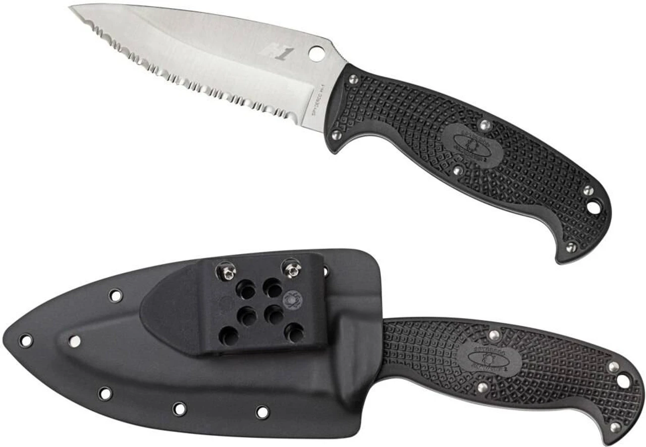 The Jumpmaster 2 faithfully retains all the key performance characteristics of the first-generation model, but packs them into a leaf-shaped blade with an acute point profile. Its hollow-ground leaf-shaped blade is made from 100%-rustproof H-1 steel and offers the same impressive cutting power and edge retention as its predecessor, but with the added benefit of a more versatile point. Injection-molded fiberglass-reinforced-nylon (FRN) scales with Bi-Directional Texturing guarantee a secure grip and are attached to the blade’s skeletonized full tang with rustproof hardware.