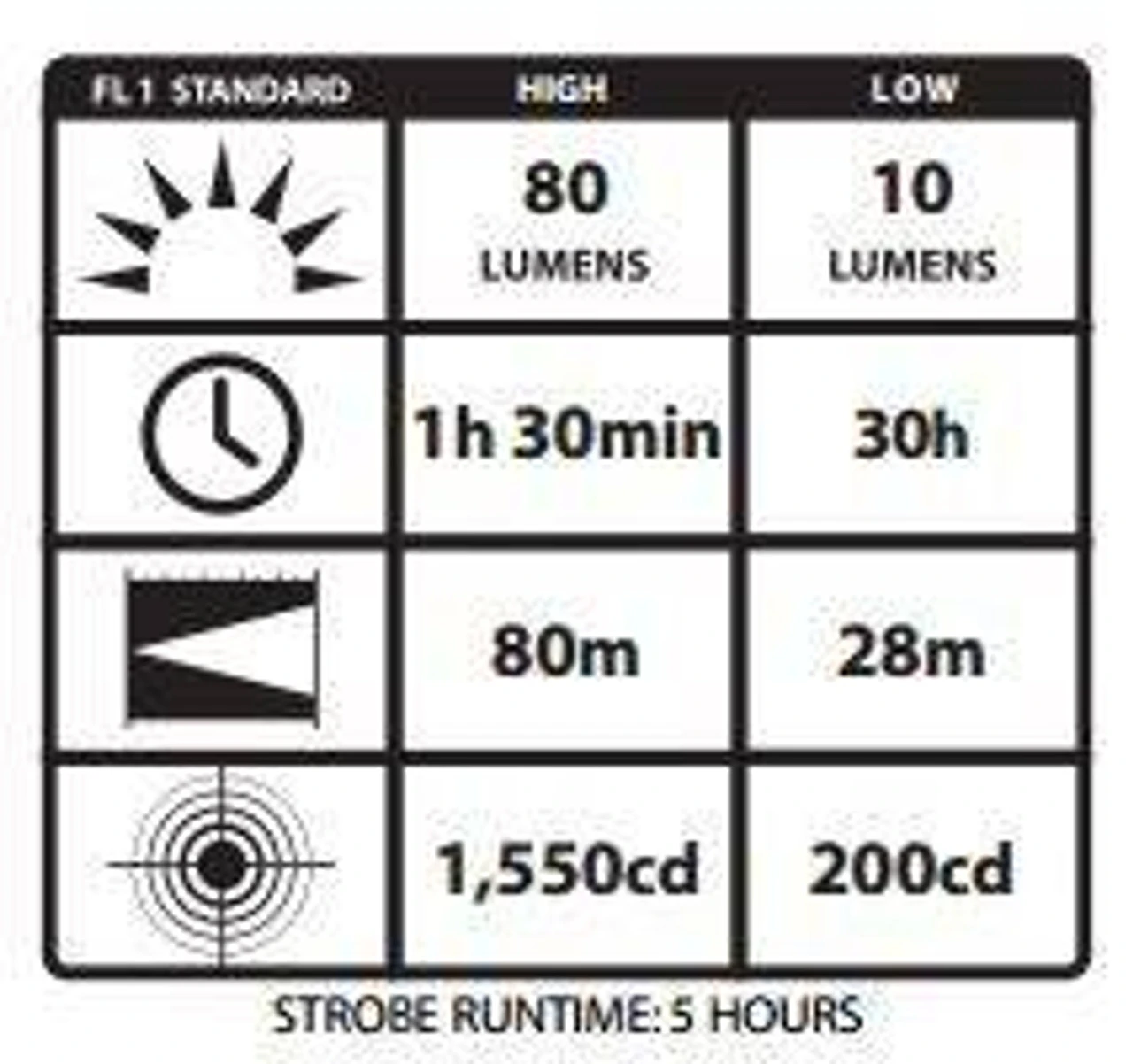 - High Output: 80 Lumens, 1550 candela peak beam intensity, 80 meter beam distance, 1.5 hours runtime