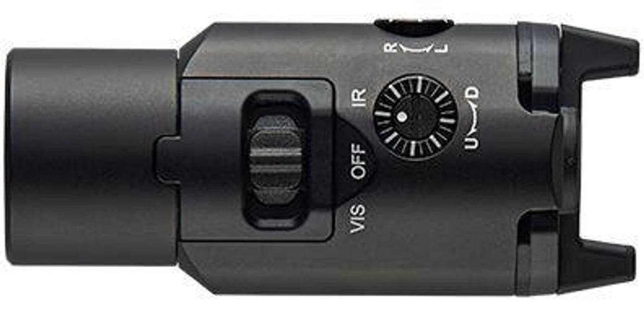 Low-profile, weapon mounted tactical light with integrated IR LED Illuminator/Laser and visible White LED Illuminator. The user transitions from white light to IR without having to remove eyes from the target or alter their controlled firing grip. IR requires night vision goggles.