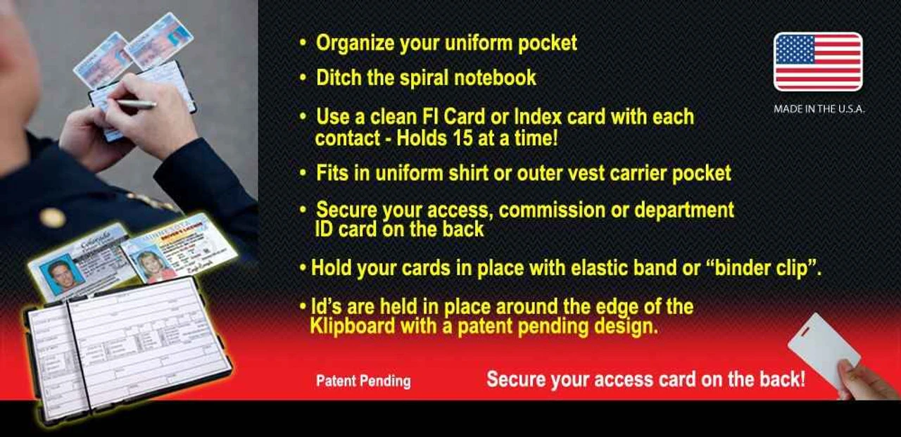 Finally, and best of all; the TPK has a patent pending pressure clip that runs across the top and bottom of your TPK. This allows you to Klip your contact’s identification conveniently along the edge of the TPK, freeing up your hands and making your contact with your subject safer. All of this organization and convenience fits perfectly in the palm of your hand and uniform pocket.