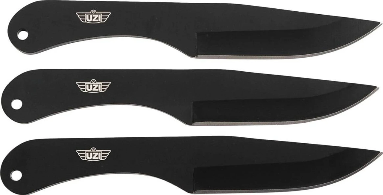 The UZI UZK-TRW-004 Throwing Knife IV features (3) straight edge, all black stainless steel blades and a leather pouch with a belt clip. The blades are perfectly balanced for accurate throwing. UZI combines advanced technical concepts with innovative designs to produce products used and trusted by the Army, Secret Service and Special Forces. Since its launch in the 1950s, UZI has become one of the world’s most famous firearm brands and a 20th century icon.