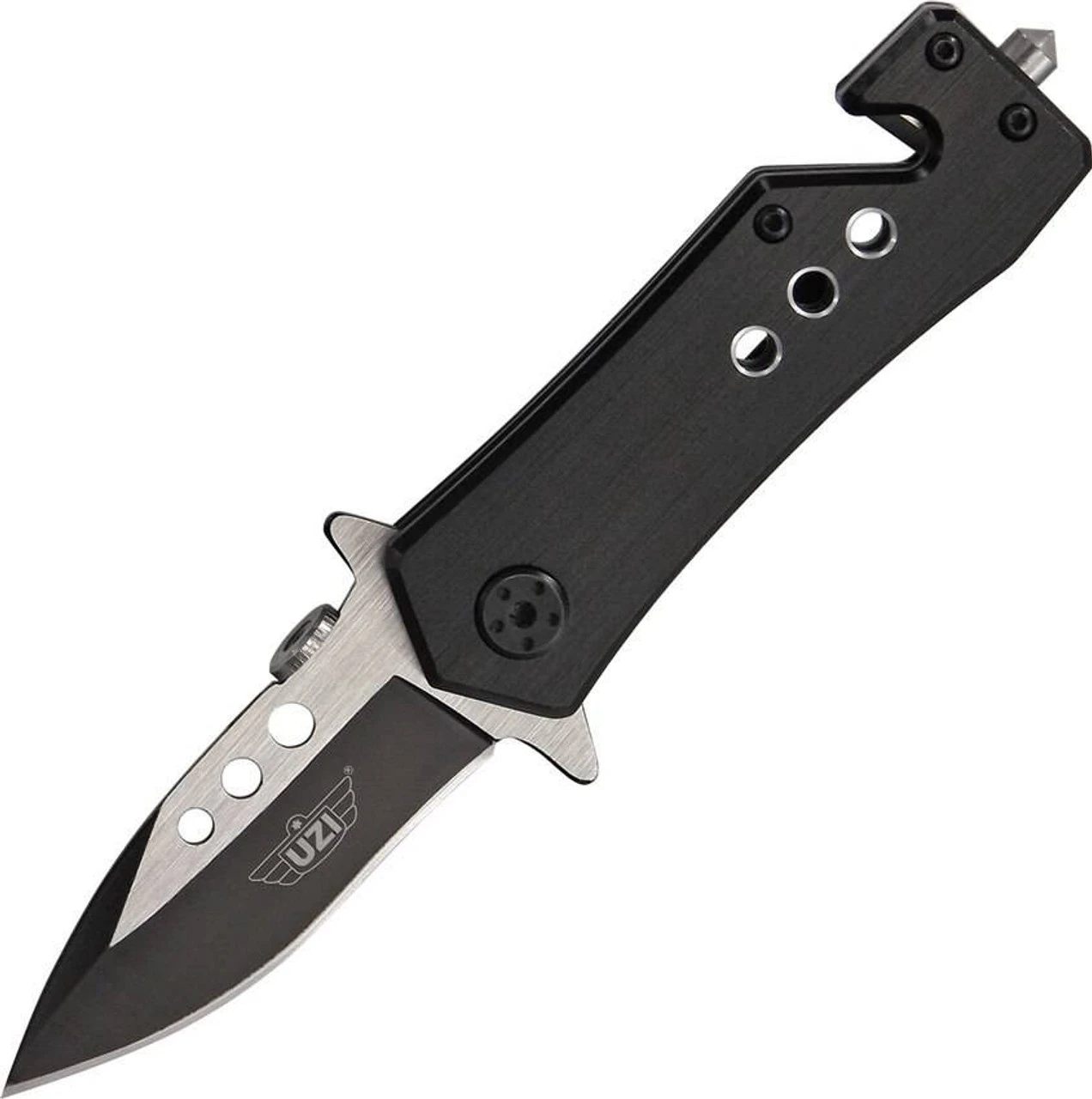UZI Zaka Micro Rescue Linerlock. 3 3/4″ closed. 2 3/8″ black and silver finish, assisted opening, stainless dagger style blade with false top edge, thumb disk, extended tang and drilled hole design. Black aluminum handles with drilled hole design. Integrated seat belt cutter and glass breaker. Black stainless pocket clip with slot cutout design.